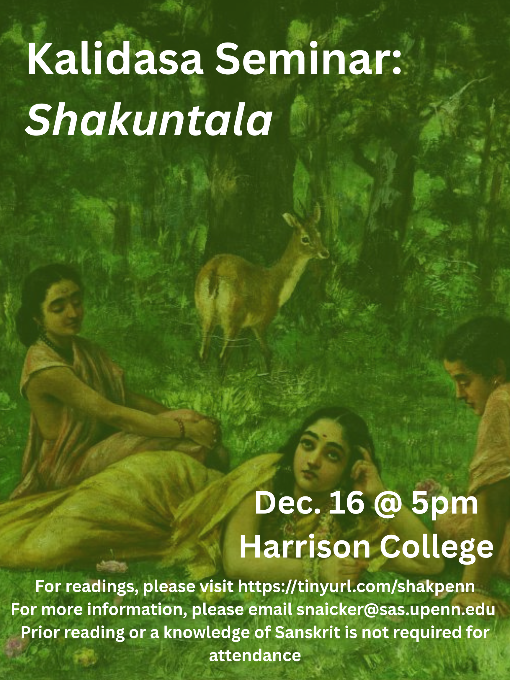 Dr. Patel and Sajiwan Naicker will be hosting the final Kalidasa seminar on Dec. 16th from 5pm at Harrison College (meet in lobby). For the fourth and final session, we will be discussing the Abhijnana Shakuntala. The Sanskrit and English texts alongside a pdf outlining background information is available at tinyurl.com/shakpenn. Pre-reading the works or a knowledge of Sanskrit is not a requirement for attendance.